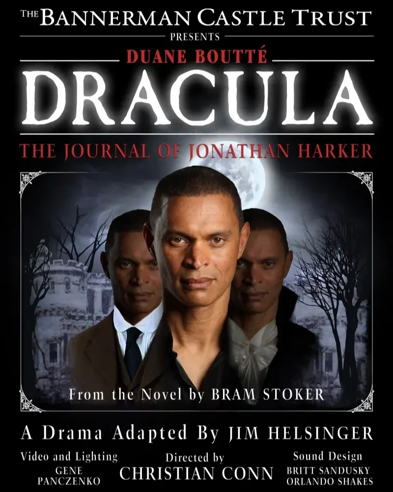Dracula: The Journal of Jonathan Harker Saturday, October 25, 2025 7:30 PM 9:30 PM Google Calendar ICS Dracula: The Journal of Jonathan Harker welcomes actor DUANE BOUTTÉ who portrays Jonathan Harker along with 9 other characters in a tour de force performance. You can find more information and tickets at bannermancastle.org
